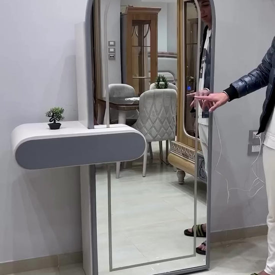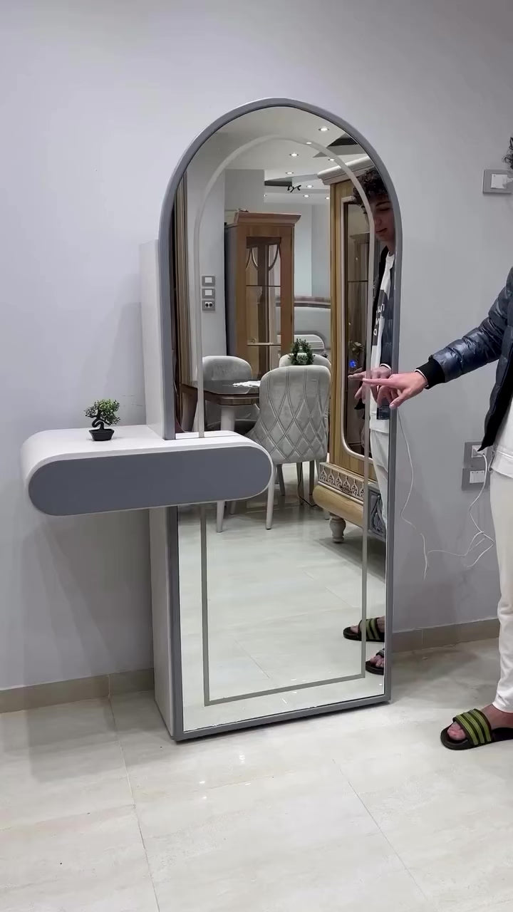 Product Description: Elevate your bedroom decor with this modern arched LED mirror vanity. Designed with a sleek wall-mounted structure, it features a built-in warm LED light that provides soft and flattering illumination — perfect for daily grooming. The attached floating shelf adds functionality and style, offering space for small décor or essentials. Ideal for contemporary interiors, this full-length dressing mirror blends aesthetics with practicality, making it a perfect addition to bedrooms, walk-in closets, or dressing areas. This Premium mirror is a must have as it bears the quality and detailing of one of the most reputed brand squaro™.